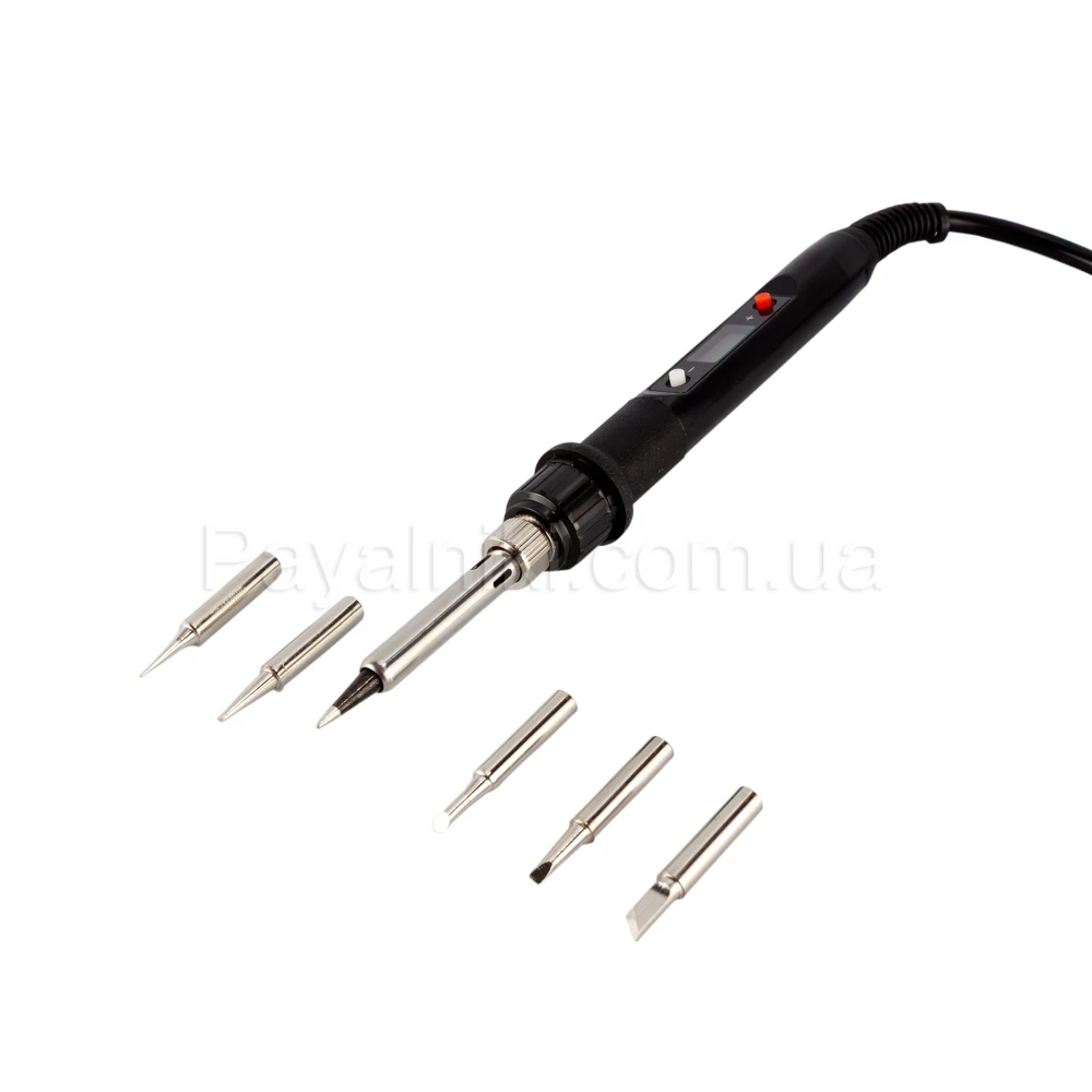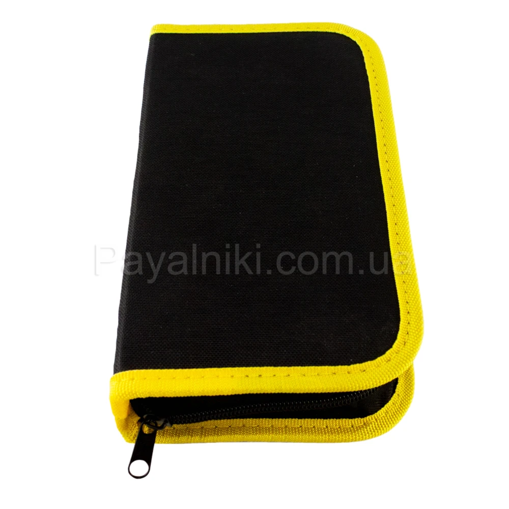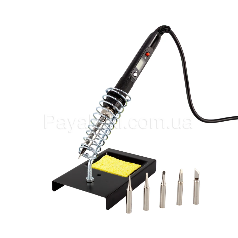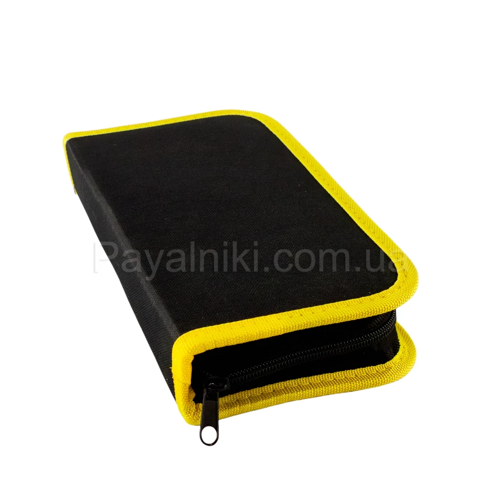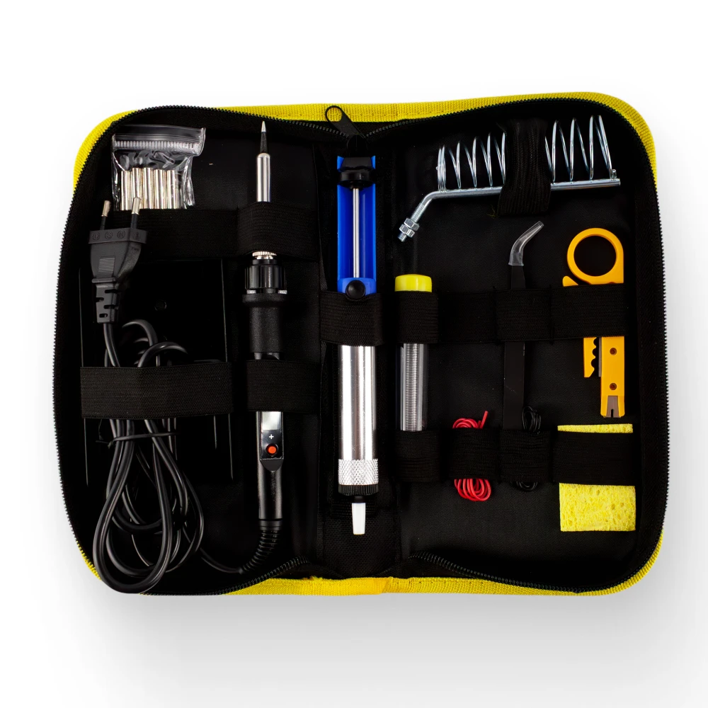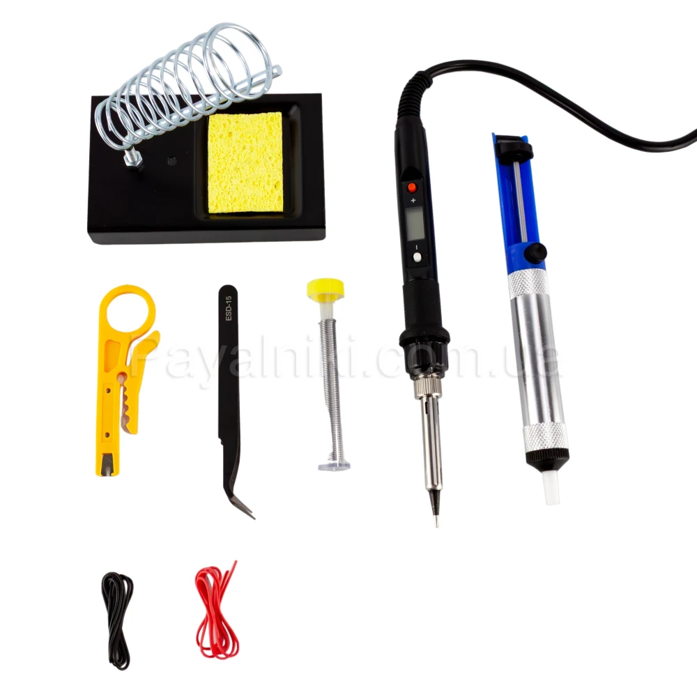 Набір для паяння у чохлі: паяльник 80 Вт із регулюванням температури, відсмоктувач припою, підставка, пінцет та припій. Продумана комплектація для ремонту плат, кабелів, роз’ємів і дрібної електромеханіки. Чохол‑органайзер з еластичними тримачами зберігає інструменти в порядку й готовності до роботи.