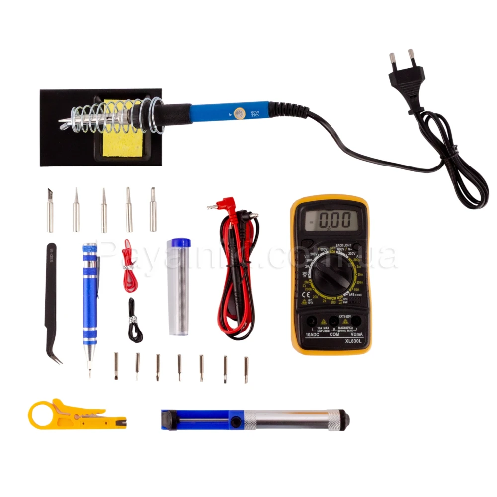 Набір для паяння з мультиметром XL830L: паяльник 60 Вт, відсмоктувач припою, щупи, жала, припій