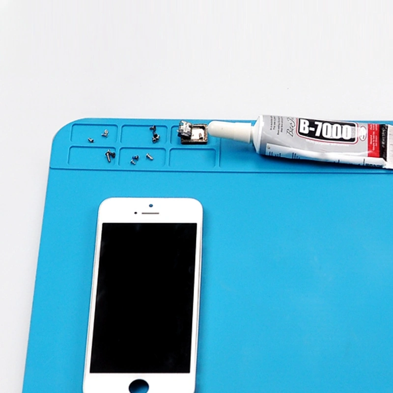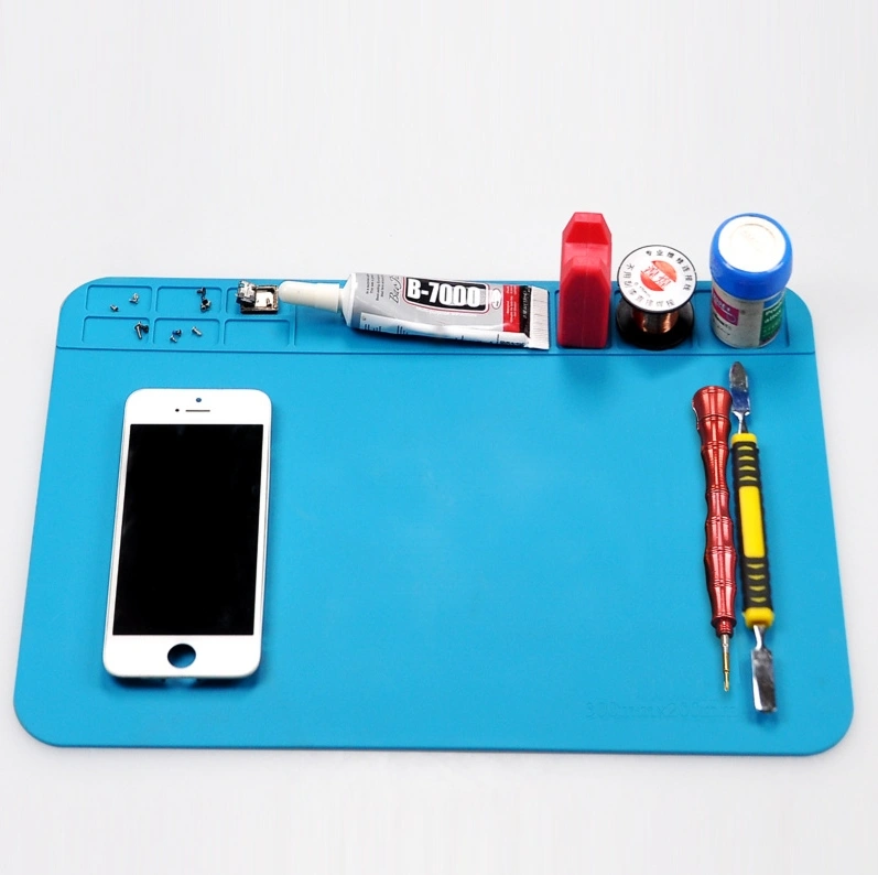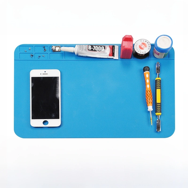 Компактний робочий килимок із термостійкого силікону для ремонту електроніки та дрібних збірок. Нековзка поверхня захищає стіл від подряпин, флюсів і високих температур, а верхні комірки допомагають впорядкувати гвинти та дрібні деталі. Гнучкий — можна скручувати для транспортування, легко миється.