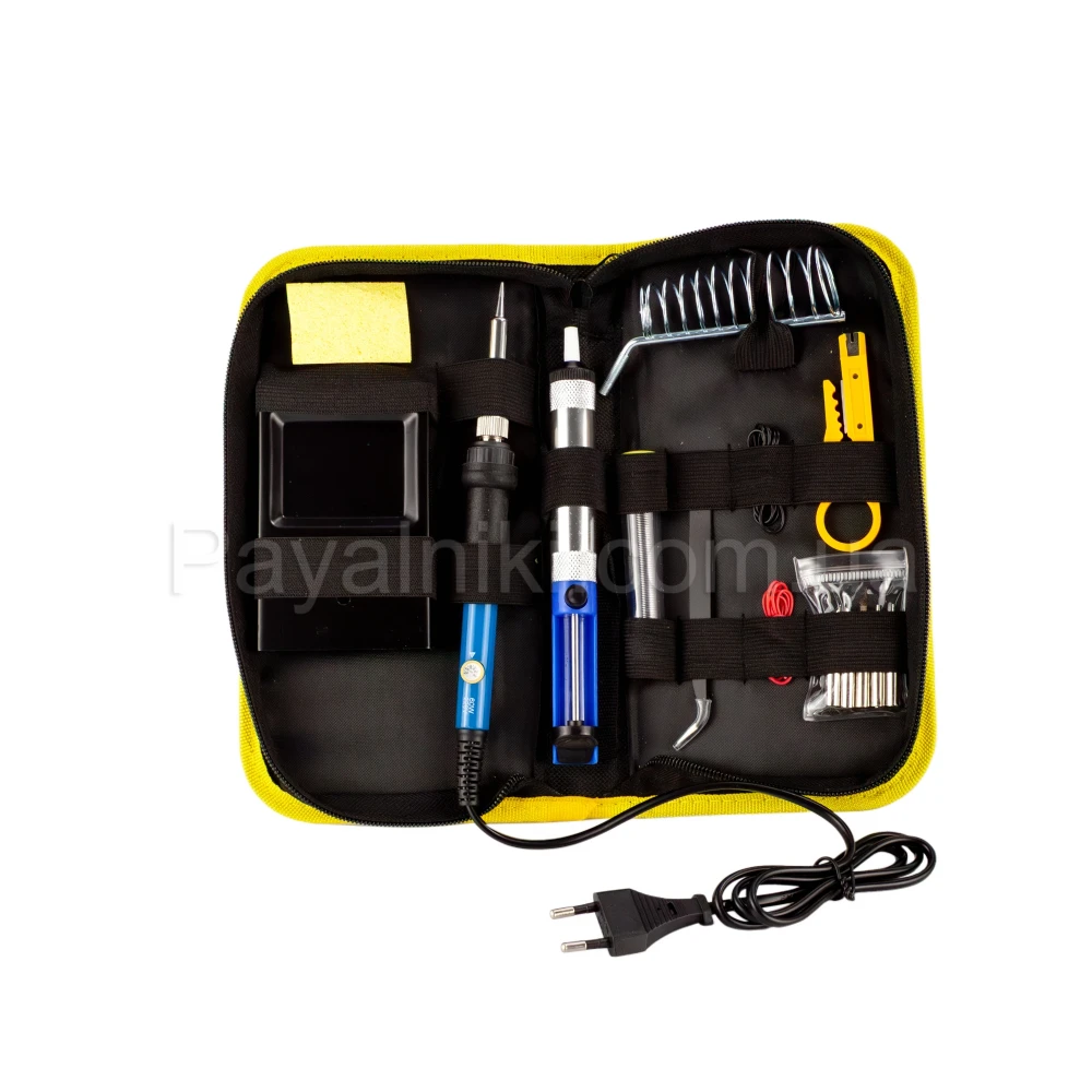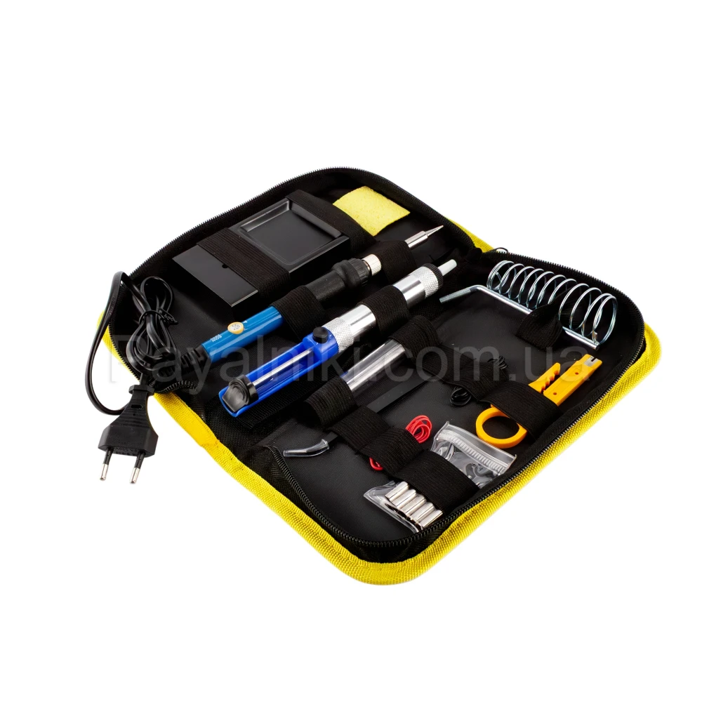 Полный набор для пайки в чехле — решение «всё-в-одном»: паяльник 60 Вт с регулировкой температуры, отсос припоя, держатель/подставка, комплект жал, пинцет и припой; подходит для ремонта электроники, мелких бытовых работ, обучения и хобби; прочный чехол обеспечивает порядок и мобильность.