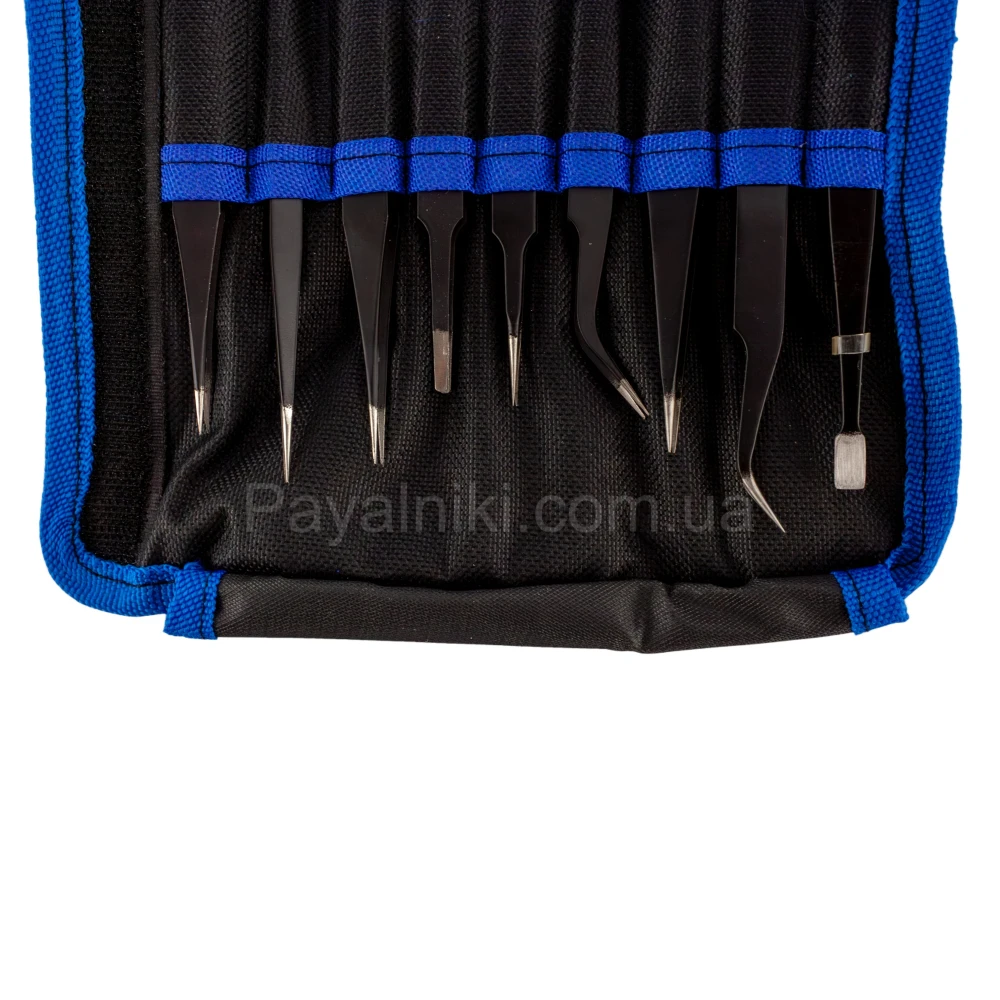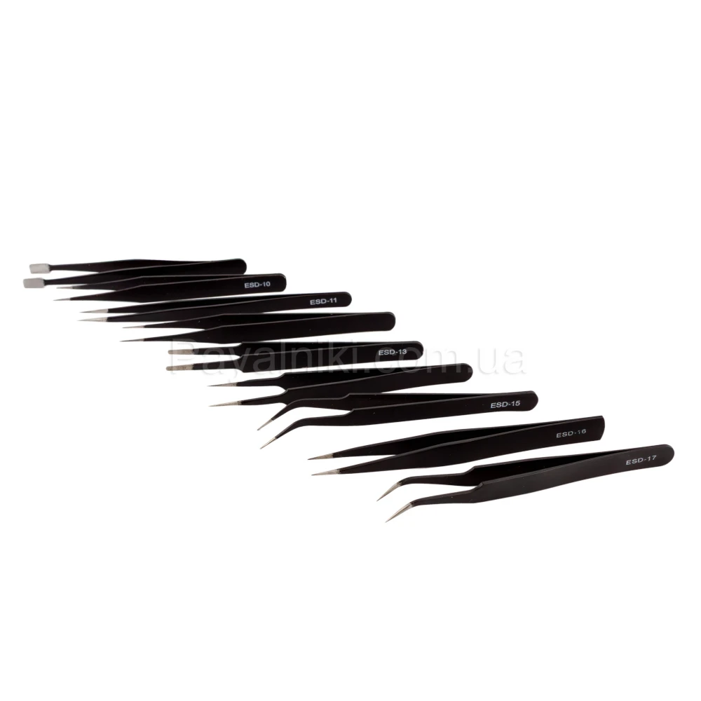 Профессиональный набор антистатичных пинцетов ESD (9 шт.) для электроники и SMD-монтажа: антистатическое покрытие защищает чувствительные компоненты, стальные наконечники обеспечивают точный хват; разные формы — прямые, изогнутые, тонкие и широкие; поставляется в удобном чехле-органайзере; оптимален для радиолюбителей и мастерских.