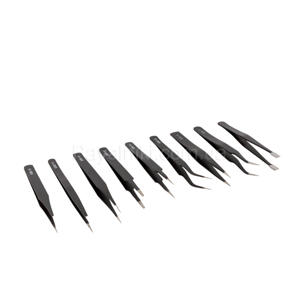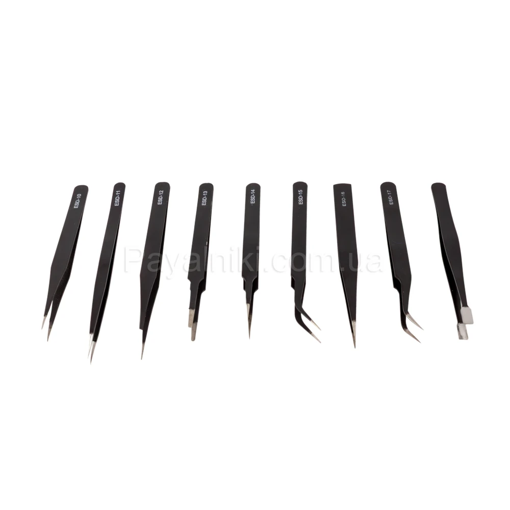 Набор антистатичных пинцетов ESD в чехле (9 шт.) для электроники и SMD-работ