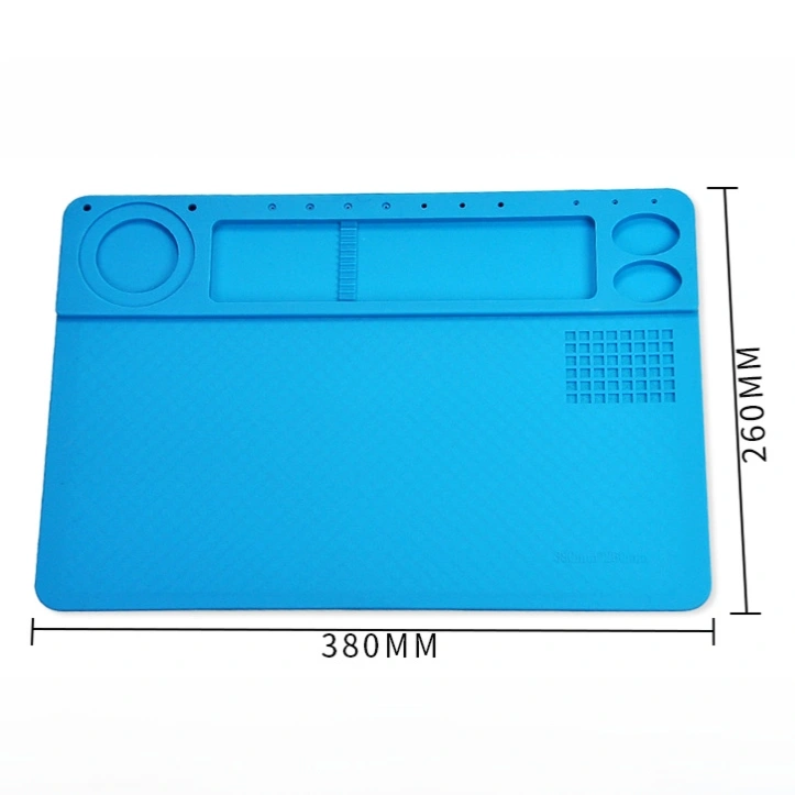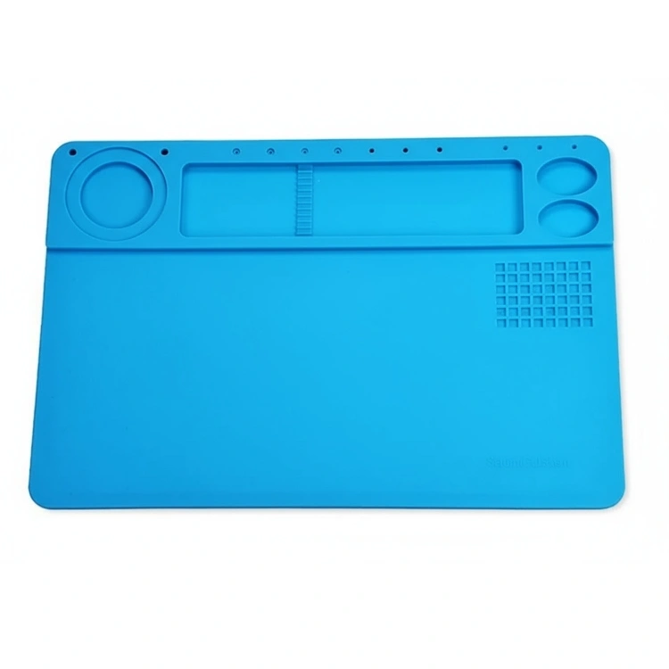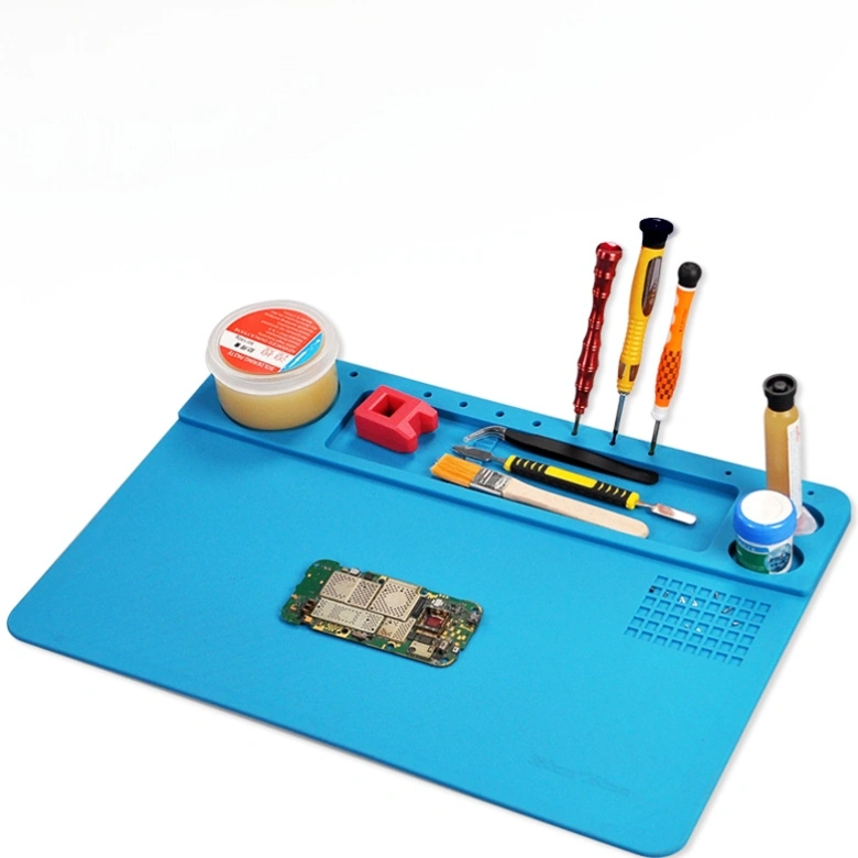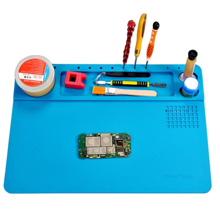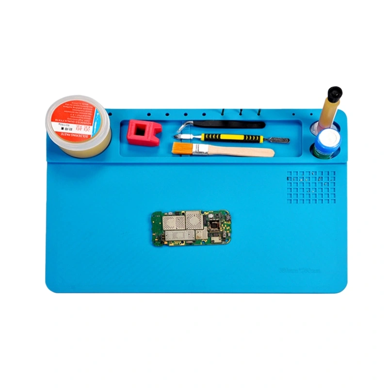 Удобная рабочая поверхность для ремонта электроники. Термостойкий силикон защищает стол от высокой температуры, флюсов и царапин, а встроенная магнитная полоса удерживает винты и мелкие детали. Сверху — длинный органайзер-лоток, круглые чашки и отверстия для отвёрток/пинцетов. Обратная сторона имеет противоскользящий рельеф.